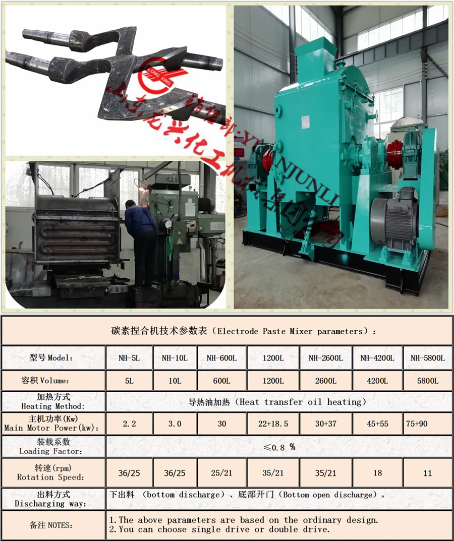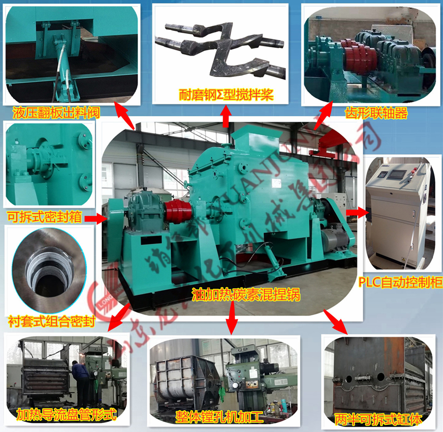 碳素捏合機(混捏鍋)用于碳素、電碳、鋁、石墨廠等工礦企業(yè)生產(chǎn)的各種規(guī)格的石墨化電極、陽極糊、高純度石墨、電碳刷及高爐塊等產(chǎn)品,通過一對不同轉(zhuǎn)速攪拌漿所產(chǎn)生強烈的剪切、擠壓及攪拌,以石油焦、無煙煤、冶金焦為主要原料,煤瀝青為粘結(jié)劑所構(gòu)成的物料充分混捏,達到物料均質(zhì)及細(xì)化之目的。